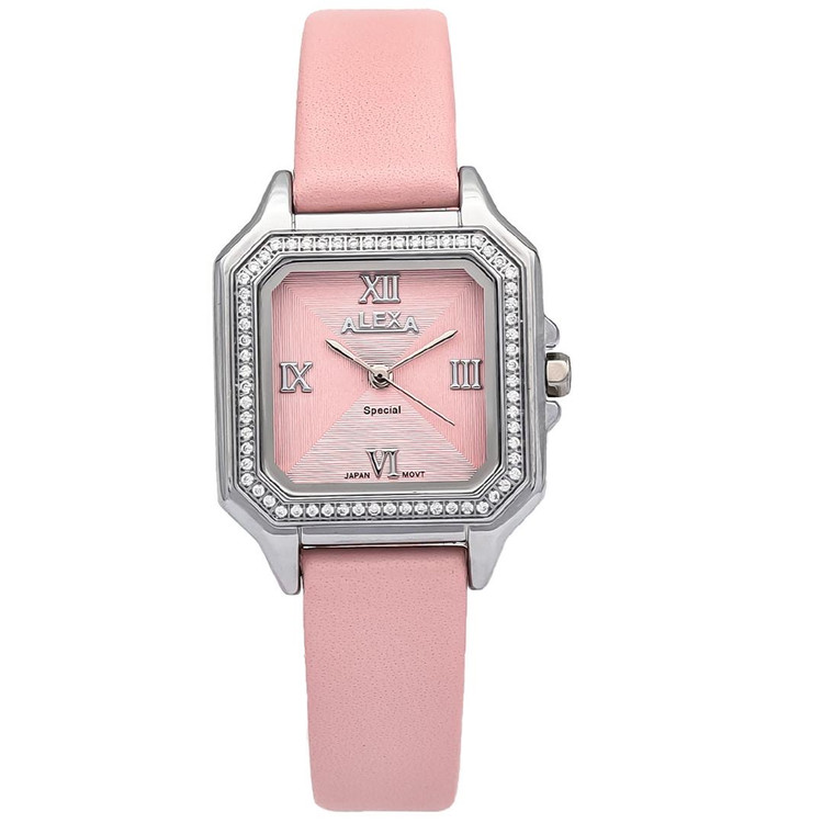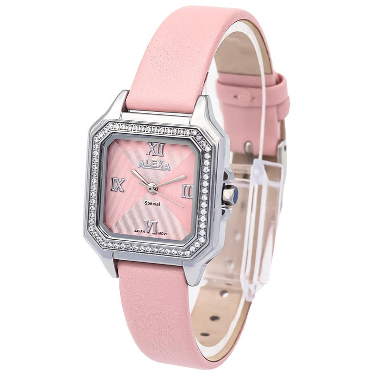 ساعت مچی الکسا زنانه بند چرم چهارگوش قاب استیل نگین دار