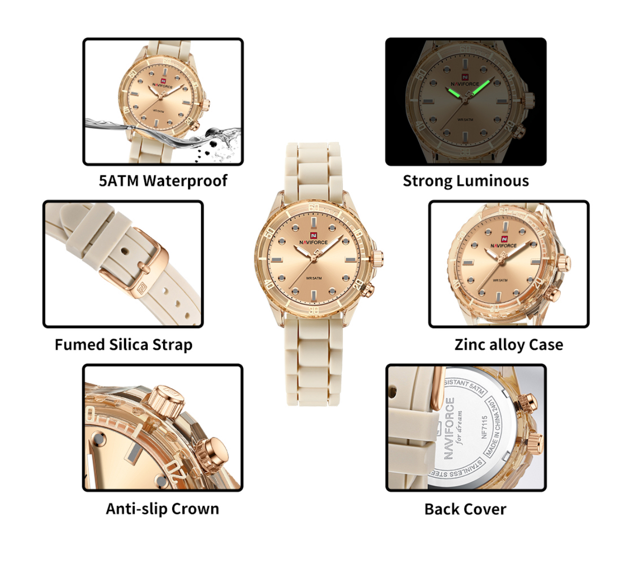 ساعت Naviforce مدل NF7115 یک ساعت زنانه اسپرت با طراحی مدرن و رنگبندی متنوعه که هم ظاهر جذابی داره و هم امکانات کاربردی. اینم مشخصات کاملش: