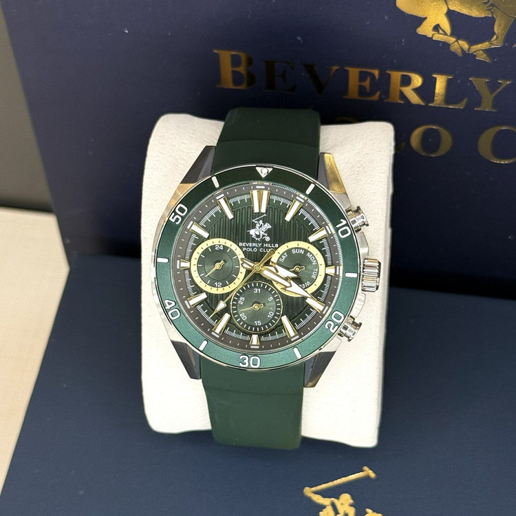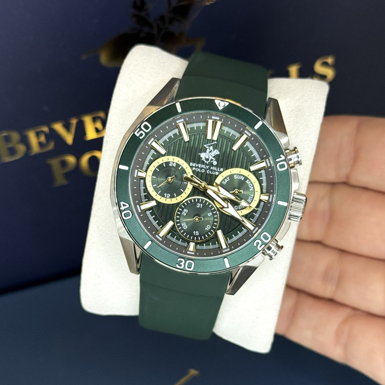 این طرح از برند ساعت پولو بورلی هیلز با طراحی خاص خود برای تیپهای اسپرت و نیمه اسپرت بسیار مناسب میباشد. بند این ساعت از جنس پلاستیک و رابر و بدنه ی این ساعت پولو از جنس استیل است و از ترکیب رنگ های نقره ای و سبز و طلایی در آن استفاده شده. از ویژگیهای منحصر به فرد این ساعت میتوان به طراحی اسپرت ساعت همراه با سه موتوره و یا فول دیت بودن آن اشاره کرد و همچنین بند آن نیز زیبایی آن را دو چندان میکند. این طرح از برند پولو دارای نمایشگر روزهای ماه و هفته و وضعیت 24 ساعته نیز است. عقربه های کوچک در این مدل از ساعت بورلی هیلز یکی نمایشگر روزهای هفته و یکی نمایشگر روزهای ماه و یکی نمایشگر وضعیت 24 ساعته میباشند. عقربه ها و ایندکس های این ساعت نیز کاملا شب نما میباشند. جنس بند و بدنه ی این ساعت از استیل 318L بوده که بهترین نوع استیل است و کاملا رنگ ثابت میباشد.