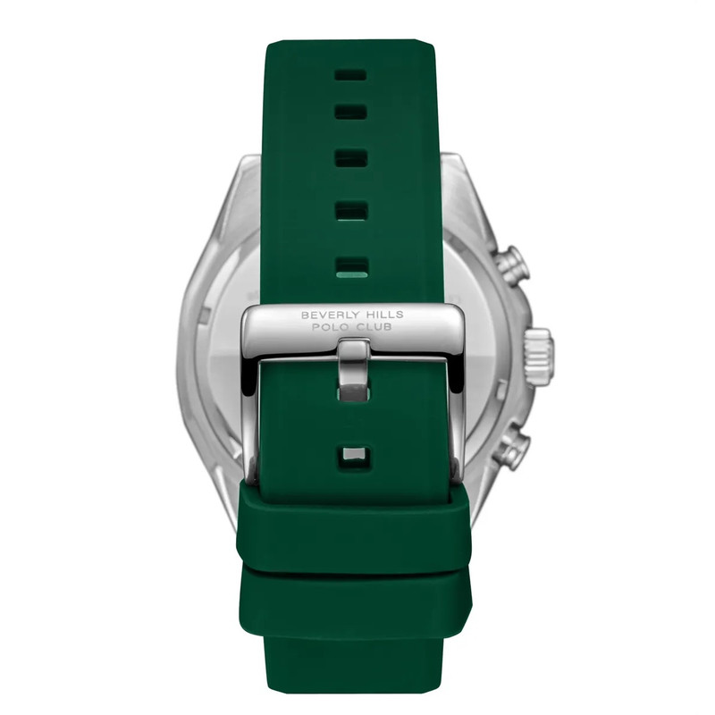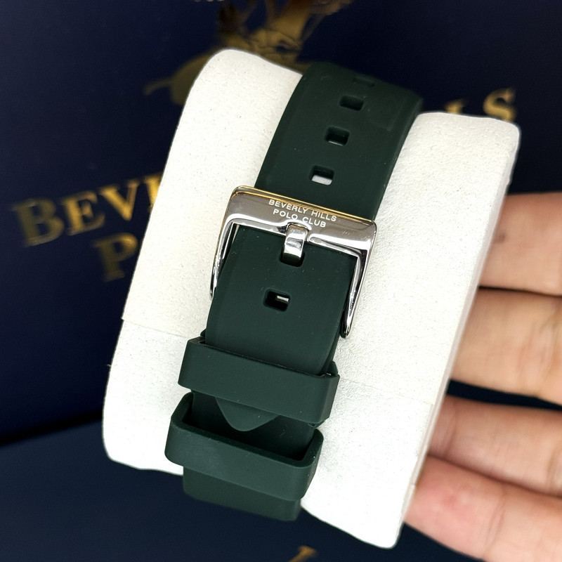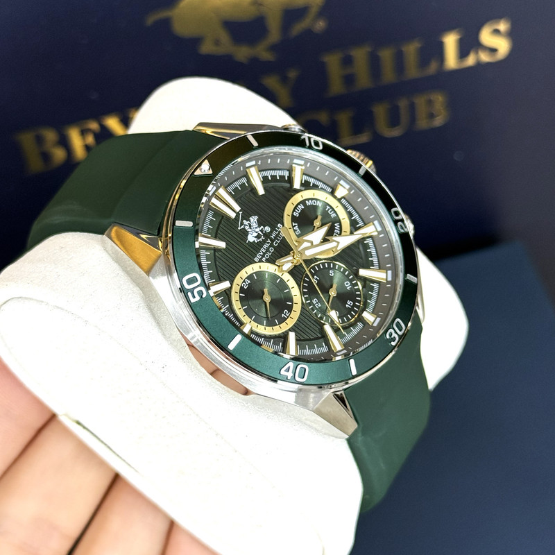 این طرح از برند ساعت پولو بورلی هیلز با طراحی خاص خود برای تیپهای اسپرت و نیمه اسپرت بسیار مناسب میباشد. بند این ساعت از جنس پلاستیک و رابر و بدنه ی این ساعت پولو از جنس استیل است و از ترکیب رنگ های نقره ای و سبز و طلایی در آن استفاده شده. از ویژگیهای منحصر به فرد این ساعت میتوان به طراحی اسپرت ساعت همراه با سه موتوره و یا فول دیت بودن آن اشاره کرد و همچنین بند آن نیز زیبایی آن را دو چندان میکند. این طرح از برند پولو دارای نمایشگر روزهای ماه و هفته و وضعیت 24 ساعته نیز است. عقربه های کوچک در این مدل از ساعت بورلی هیلز یکی نمایشگر روزهای هفته و یکی نمایشگر روزهای ماه و یکی نمایشگر وضعیت 24 ساعته میباشند. عقربه ها و ایندکس های این ساعت نیز کاملا شب نما میباشند. جنس بند و بدنه ی این ساعت از استیل 318L بوده که بهترین نوع استیل است و کاملا رنگ ثابت میباشد.