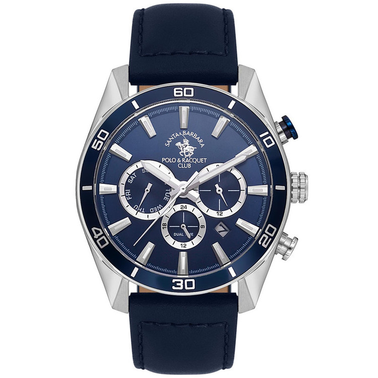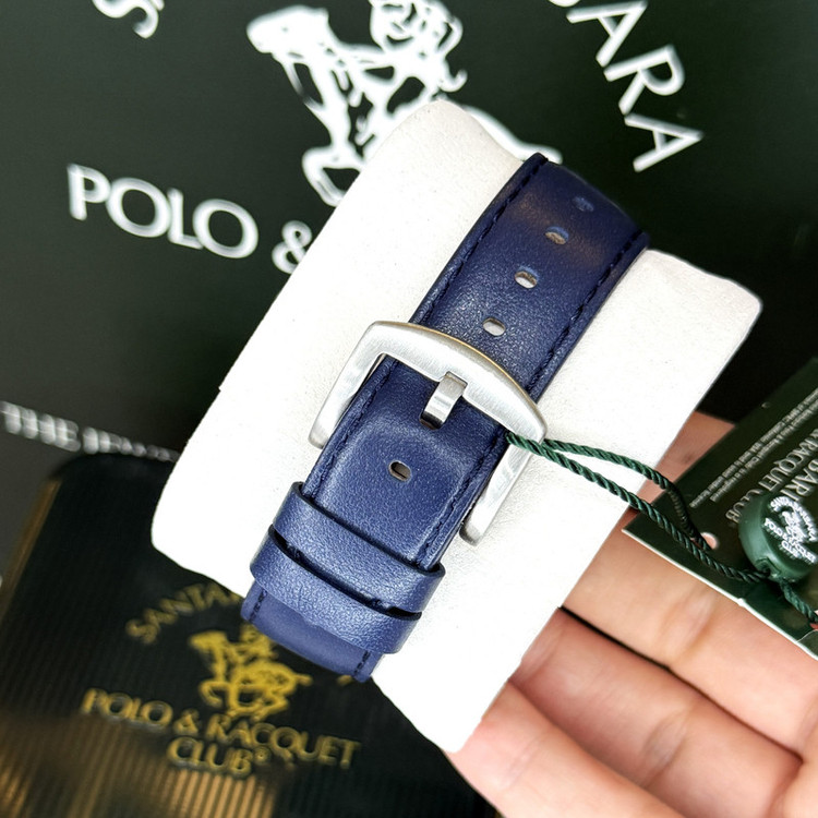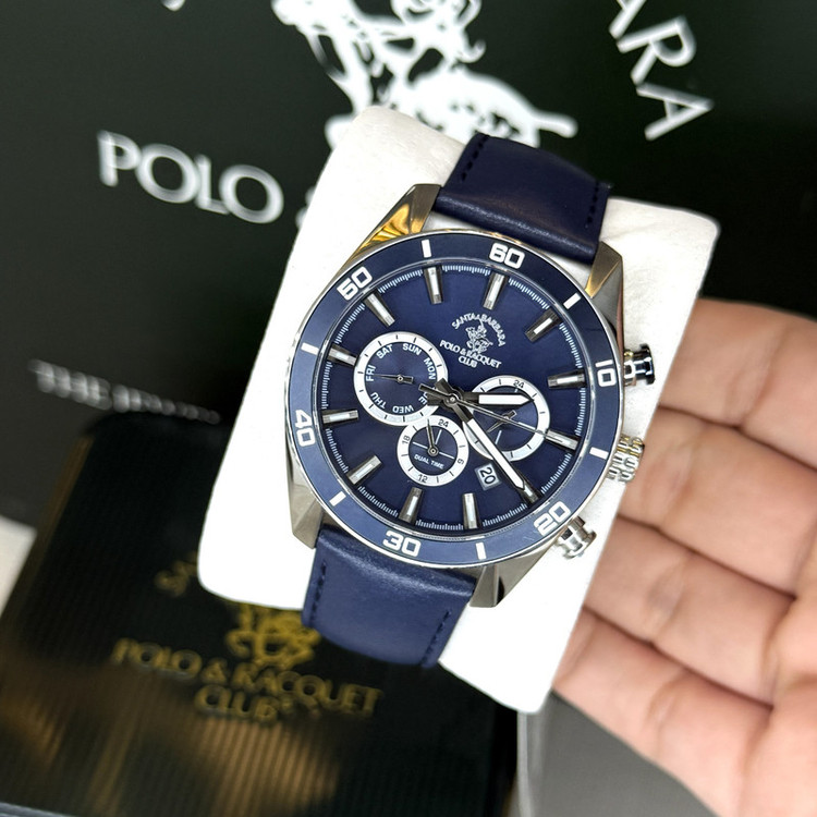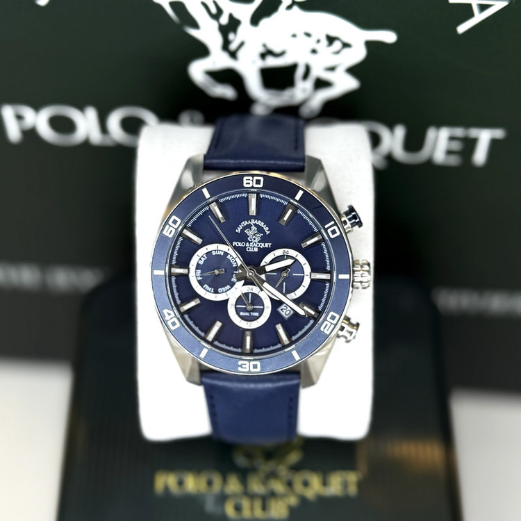 این طرح از برند ساعت پولو سانتا باربارا با طراحی خاص خود برای تیپهای اسپرت و نیمه مجلسی بسیار مناسب میباشد. بند این ساعت پولو از جنس چرم و بدنه ی آن از جنس استیل است و از ترکیب رنگ های سرمه ای و نقره ای در آن استفاده شده است. از ویژگیهای منحصر به فرد این ساعت میتوان به طراحی ساده ی ساعت اشاره کرد که برای تیپهای مجلسی و رسمی بسیار مناسب میباشد و از طرفی نیز سه موتوره بودن آن حالت اسپرتی به ساعت بخشیده است. همچنین این طرح از برند پولو دارای نمایشگر روزهای ماه و هفته و وضعیت 24 ساعته بوده و دو تایمه بوده و دو ساعت را به صورت همزمان نمایش میدهد. جنس بدنه ی این ساعت از استیل 318L بوده که بهترین نوع استیل است و کاملا رنگ ثابت میباشد.
