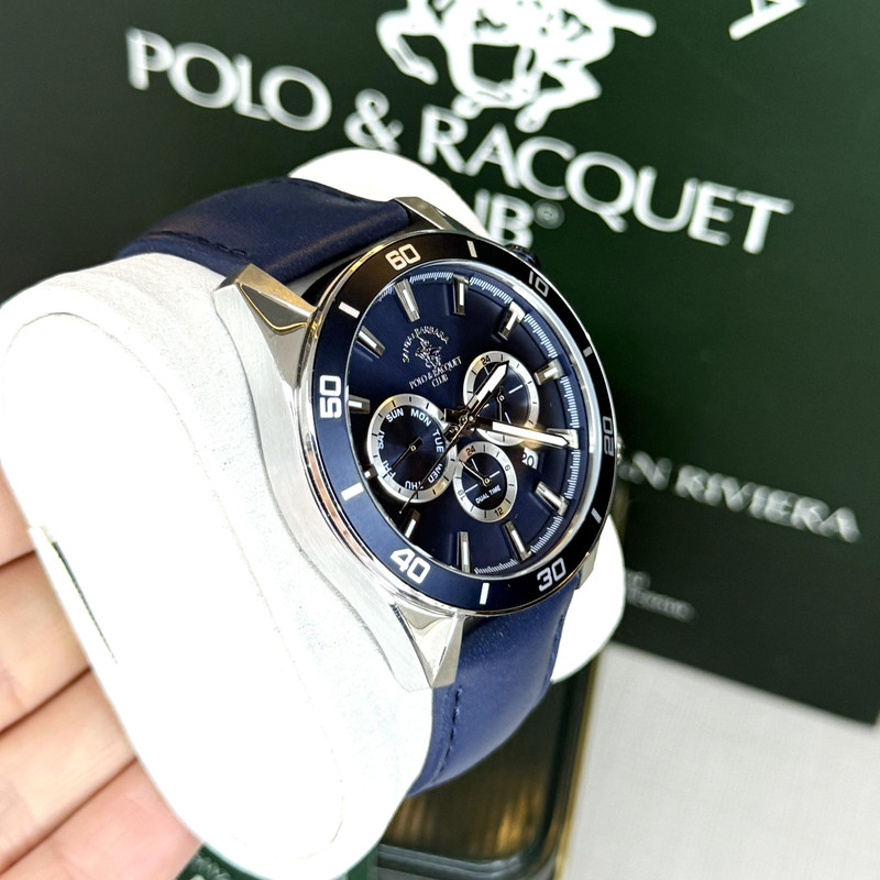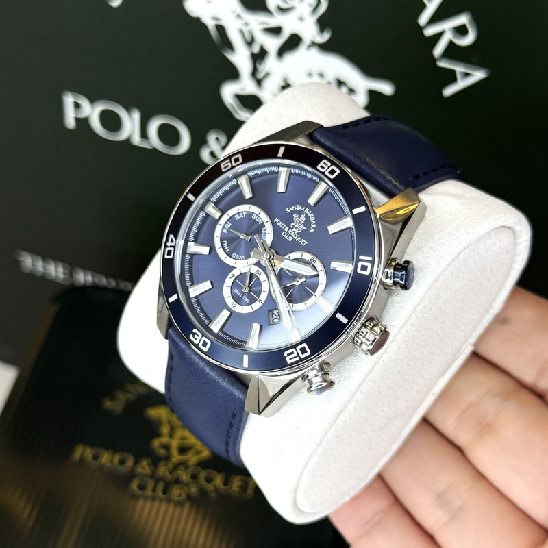 این طرح از برند ساعت پولو سانتا باربارا با طراحی خاص خود برای تیپهای اسپرت و نیمه مجلسی بسیار مناسب میباشد. بند این ساعت پولو از جنس چرم و بدنه ی آن از جنس استیل است و از ترکیب رنگ های سرمه ای و نقره ای در آن استفاده شده است. از ویژگیهای منحصر به فرد این ساعت میتوان به طراحی ساده ی ساعت اشاره کرد که برای تیپهای مجلسی و رسمی بسیار مناسب میباشد و از طرفی نیز سه موتوره بودن آن حالت اسپرتی به ساعت بخشیده است. همچنین این طرح از برند پولو دارای نمایشگر روزهای ماه و هفته و وضعیت 24 ساعته بوده و دو تایمه بوده و دو ساعت را به صورت همزمان نمایش میدهد. جنس بدنه ی این ساعت از استیل 318L بوده که بهترین نوع استیل است و کاملا رنگ ثابت میباشد.