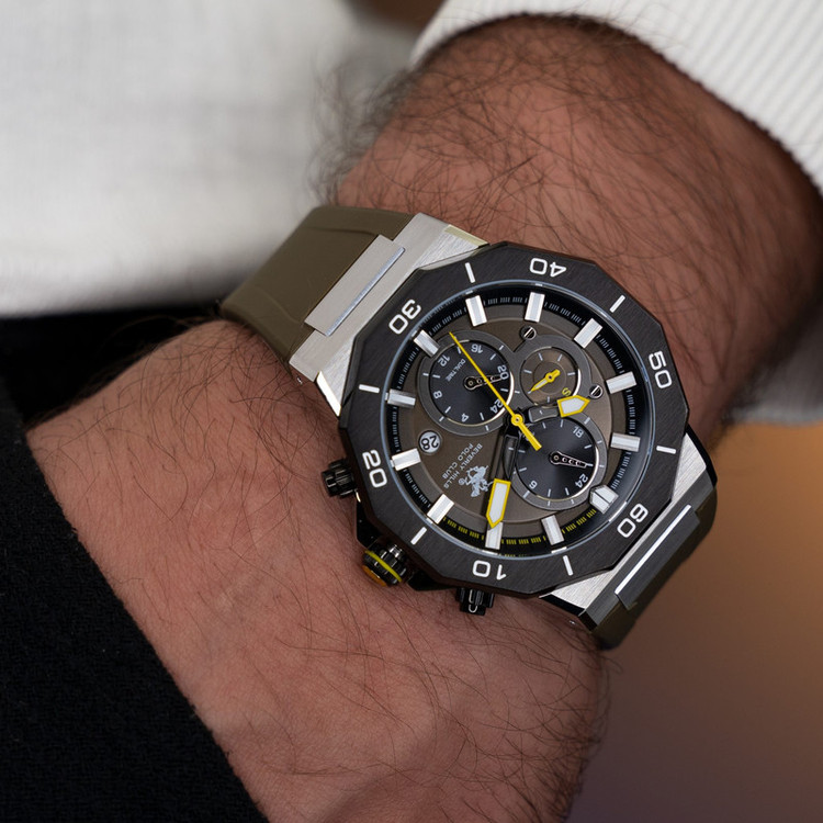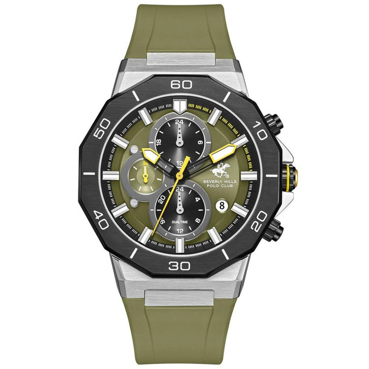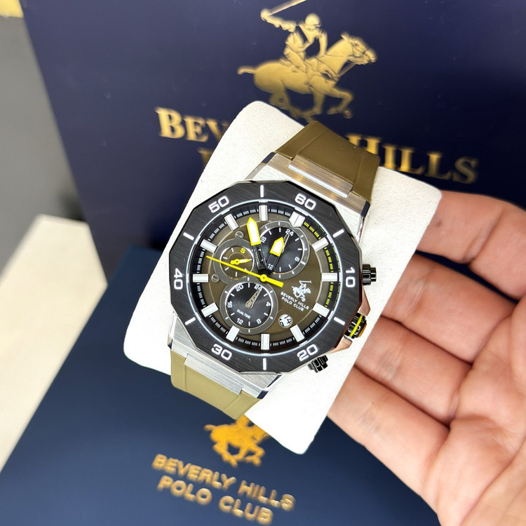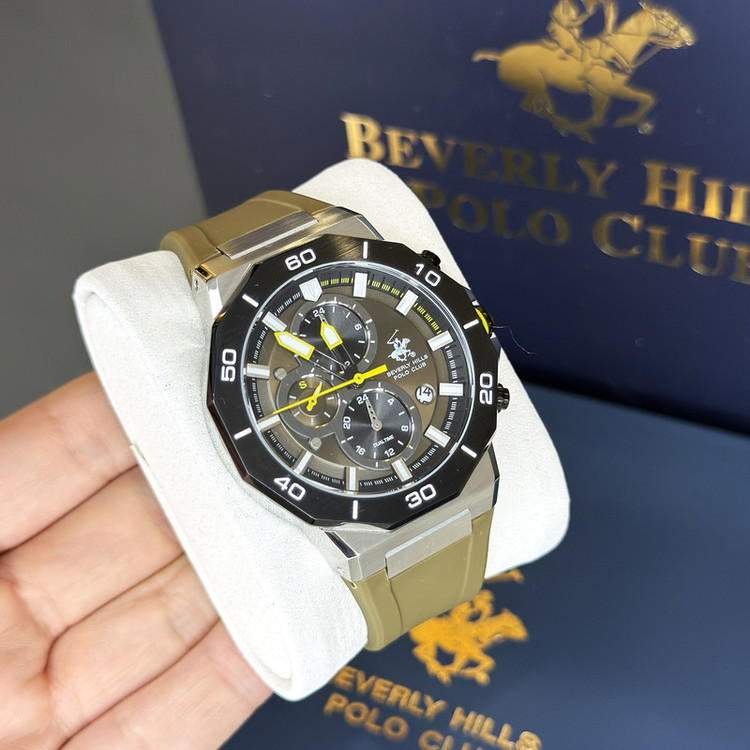 این طرح از برند ساعت پولو بورلی هیلز با طراحی خاص خود برای تیپهای اسپرت و نیمه اسپرت بسیار مناسب میباشد. بدنه ی این ساعت پولو از جنس استیل است و بند آن پلاستیک و یا رابر میباشد و از ترکیب رنگ های مشکی و سبز و نقره ای در آن استفاده شده. از ویژگیهای منحصر به فرد این ساعت میتوان به طراحی اسپرت ساعت همراه با سه موتوره و یا فول دیت بودن آن اشاره کرد و همچنین بدنه ی این ساعت نیز زیبایی آن را دو چندان میکند. این طرح از برند پولو دارای نمایشگر روزهای ماه و هفته و وضعیت 24 ساعته نیز است. عقربه ی کوچک پایینی ساعت نیز ساعت متفاوتی است که با دکمه های بالا و پایین میشود آن را به ساعت کشور های دیگری تنظیم کرد. عقربه ها و ایندکس های ساعت نیز شبنما میباشند و در تاریکی به راحتی خوانده میشوند. جنس بدنه ی این ساعت از استیل 318L بوده که بهترین نوع استیل است و کاملا رنگ ثابت میباشد.