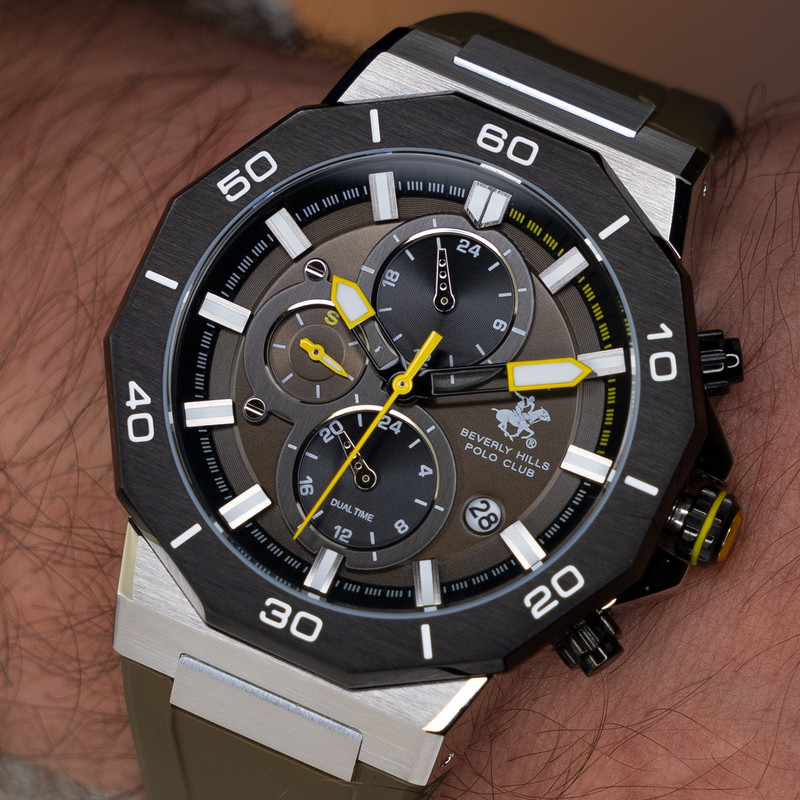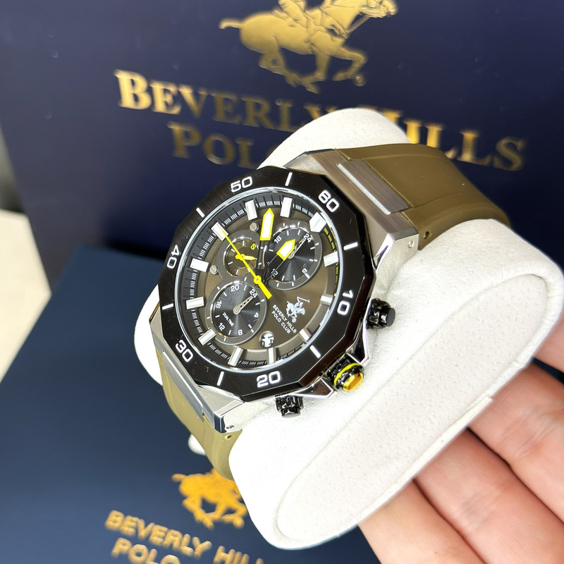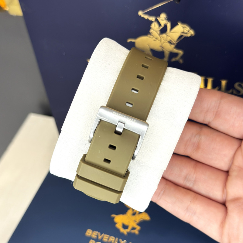 این طرح از برند ساعت پولو بورلی هیلز با طراحی خاص خود برای تیپهای اسپرت و نیمه اسپرت بسیار مناسب میباشد. بدنه ی این ساعت پولو از جنس استیل است و بند آن پلاستیک و یا رابر میباشد و از ترکیب رنگ های مشکی و سبز و نقره ای در آن استفاده شده. از ویژگیهای منحصر به فرد این ساعت میتوان به طراحی اسپرت ساعت همراه با سه موتوره و یا فول دیت بودن آن اشاره کرد و همچنین بدنه ی این ساعت نیز زیبایی آن را دو چندان میکند. این طرح از برند پولو دارای نمایشگر روزهای ماه و هفته و وضعیت 24 ساعته نیز است. عقربه ی کوچک پایینی ساعت نیز ساعت متفاوتی است که با دکمه های بالا و پایین میشود آن را به ساعت کشور های دیگری تنظیم کرد. عقربه ها و ایندکس های ساعت نیز شبنما میباشند و در تاریکی به راحتی خوانده میشوند. جنس بدنه ی این ساعت از استیل 318L بوده که بهترین نوع استیل است و کاملا رنگ ثابت میباشد.