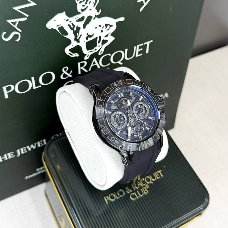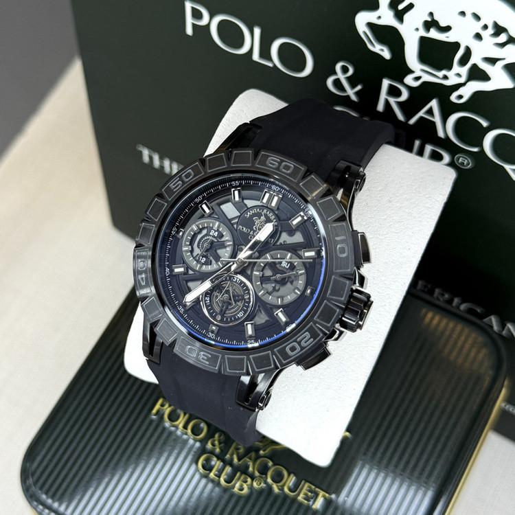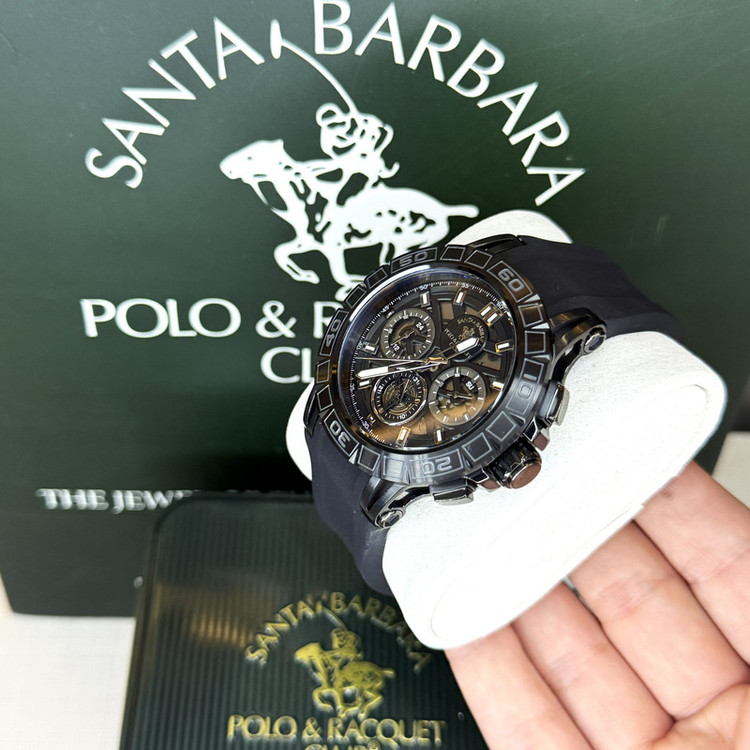 این طرح از برند ساعت پولو سانتا باربارا با طراحی خاص خود برای تیپهای اسپرت و نیمه اسپرت بسیار مناسب میباشد. بند این ساعت پولو از جنس رابر یا پلاستیک فشرده و نرم و بدنه ی آن از جنس استیل است و از رنگ مشکی در آن استفاده شده است. از ویژگیهای منحصر به فرد این ساعت میتوان به طراحی زمخت و اسپرت ساعت اشاره کرد که برای تیپهای اسپرت و روزمره بسیار مناسب میباشد و از طرفی نیز سه موتوره بودن آن که حالت اسپرتی به ساعت بخشیده است. همچنین این طرح از برند پولو دارای نمایشگر روزهای ماه و هفته و وضعیت 24 ساعته است. عقربه ها و ایندکس های ساعت نیز کاملا شبنما میباشند و در تاریکی به راحتی قابل خواندن است. جنس بدنه ی این ساعت از استیل 318L بوده که بهترین نوع استیل است و کاملا رنگ ثابت میباشد.