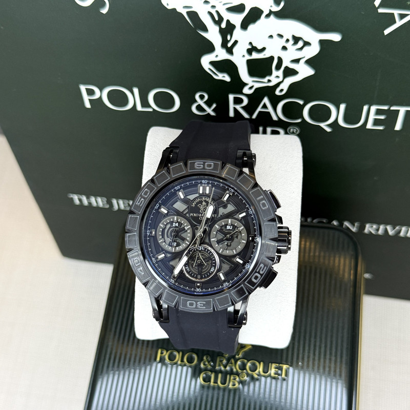 این طرح از برند ساعت پولو سانتا باربارا با طراحی خاص خود برای تیپهای اسپرت و نیمه اسپرت بسیار مناسب میباشد. بند این ساعت پولو از جنس رابر یا پلاستیک فشرده و نرم و بدنه ی آن از جنس استیل است و از رنگ مشکی در آن استفاده شده است. از ویژگیهای منحصر به فرد این ساعت میتوان به طراحی زمخت و اسپرت ساعت اشاره کرد که برای تیپهای اسپرت و روزمره بسیار مناسب میباشد و از طرفی نیز سه موتوره بودن آن که حالت اسپرتی به ساعت بخشیده است. همچنین این طرح از برند پولو دارای نمایشگر روزهای ماه و هفته و وضعیت 24 ساعته است. عقربه ها و ایندکس های ساعت نیز کاملا شبنما میباشند و در تاریکی به راحتی قابل خواندن است. جنس بدنه ی این ساعت از استیل 318L بوده که بهترین نوع استیل است و کاملا رنگ ثابت میباشد.