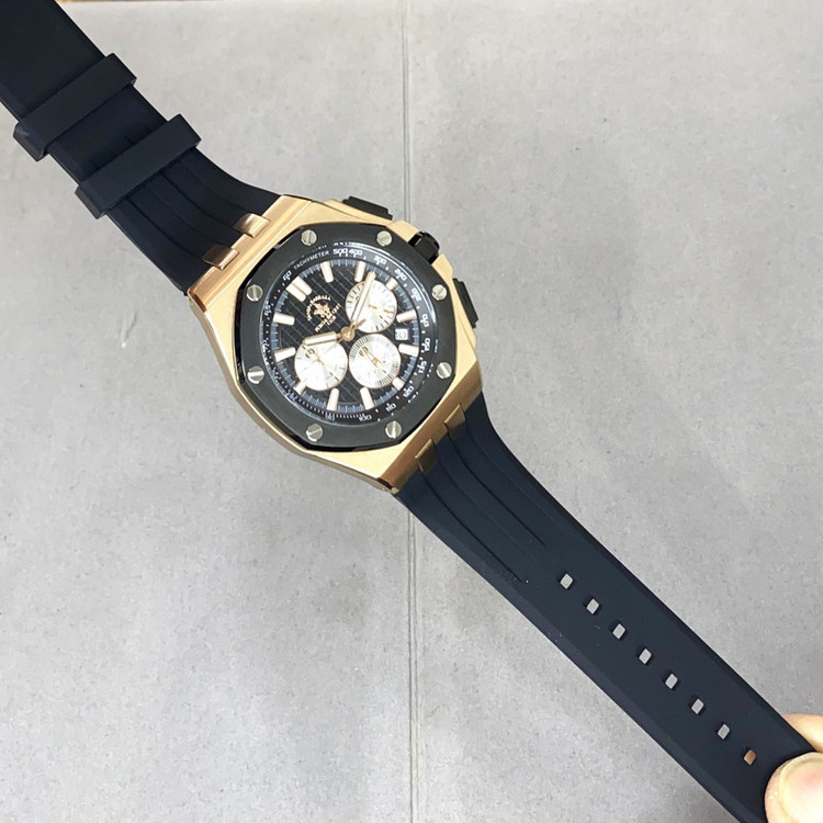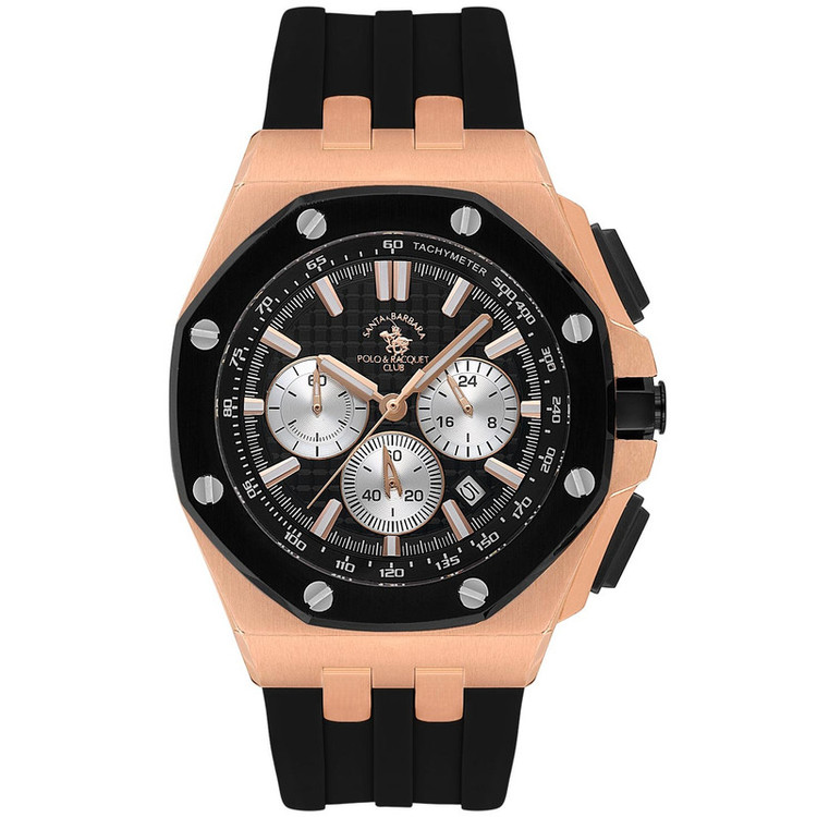 این طرح از برند پولو سانتا باربارا از جذاب ترین و پر فروشترین طراحی های این برند محبوب میباشد. در طراحی این مدل از رنگهای نقره ای و مشکی و رزگلد استفاده شده است و طراحی بدنه ی این مدل از سانتا باربارا به شکل جذابی به صورت چند ضلعی طراحی گردیده است و پیچ های دور صفحه ی ساعت نیز بر زیبایی این طرح افزوده و همین امر باعث گردیده این طراحی بسیار به روز و جوان پسند باشد. علاوه بر آن رنگ و طراحی بینظیر صفحه ی ساعت نیز که با طراحی بدنه هماهنگی بینظیری دارد بر زیبایی این ساعت افزوده است. و همچنین بند ساعت هم حالت اسپرت و جوان پسندی دارد و همین دلایل باعث گردیده این ساعت از پولو سانتا بابارا از پر فروشترین های این برند محبوب باشد.