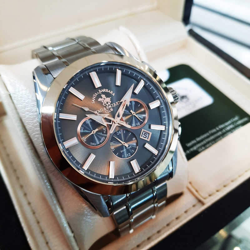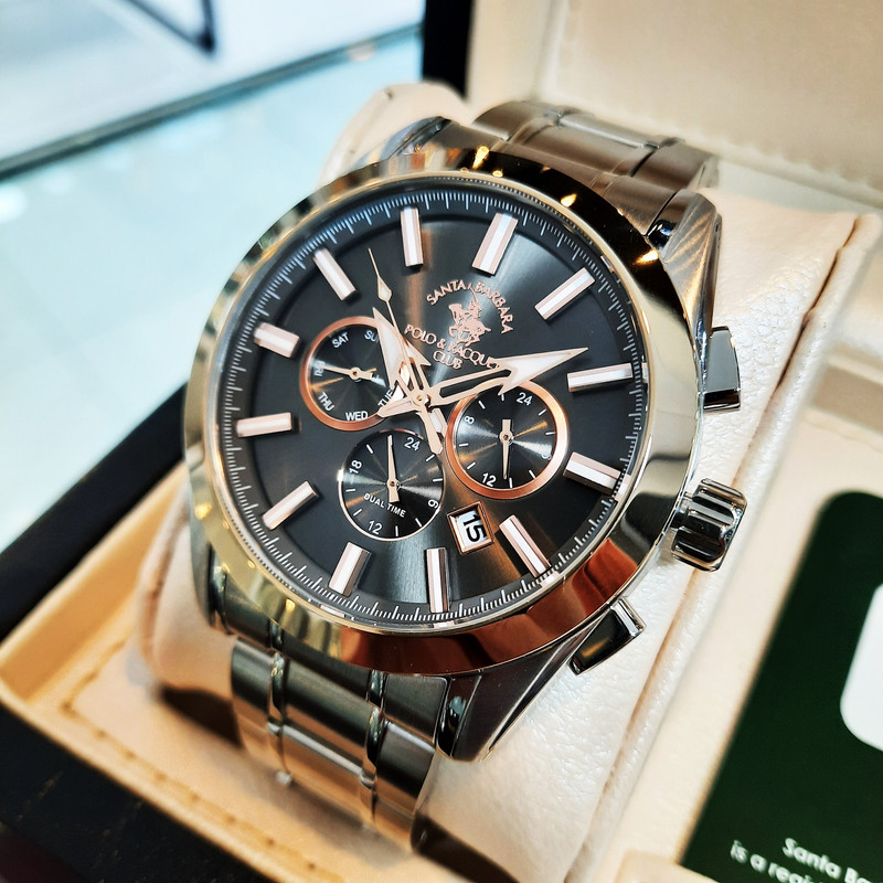 این طرح از برند ساعت پولو سانتا باربارا با طراحی خاص خود برای تیپهای اسپرت و نیمه مجلسی بسیار مناسب میباشد. بند و بدنه ی این ساعت پولو از جنس استیل است و از ترکیب رنگ های خاکستری و رزگلد و نقره ای ای در آن استفاده شده است. از ویژگیهای منحصر به فرد این ساعت میتوان به طراحی ساده ی ساعت اشاره کرد که برای تیپهای مجلسی و رسمی بسیار مناسب میباشد و از طرفی نیز سه موتوره بودن آن حالت اسپرتی به ساعت بخشیده است. همچنین این طرح از برند پولو دارای نمایشگر روزهای ماه و هفته و وضعیت 24 ساعته و دوزمانه میباشد.