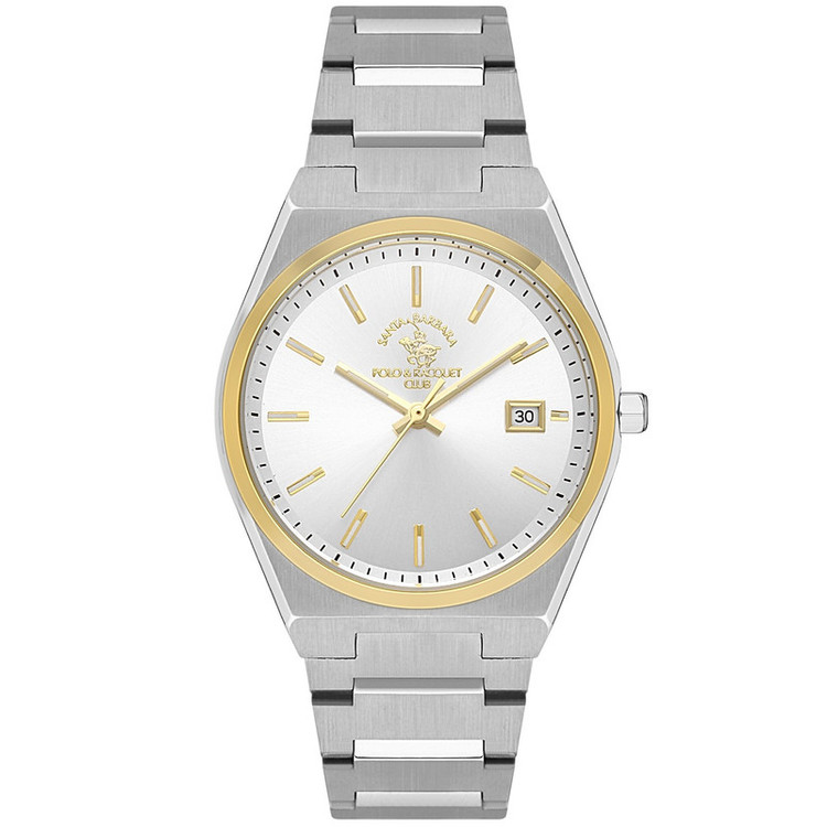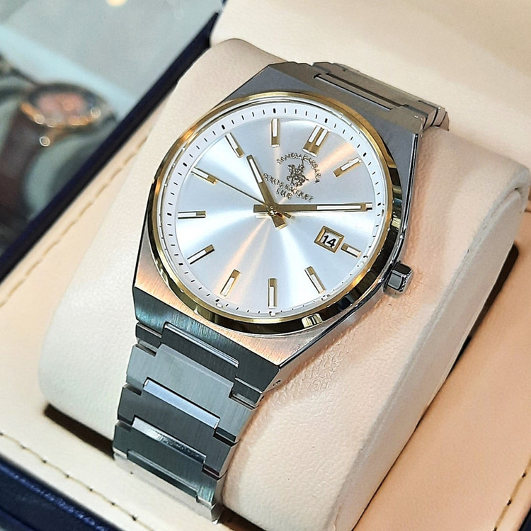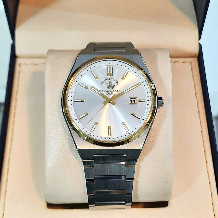 این طرح از برند ساعت پولو با طراحی خاص خود برای تیپهای مجلسی و نیمه اسپرت بسیار مناسب میباشد. بند و بدنه ی این ساعت پولو از جنس استیل است و از ترکیب رنگ نقره ای و طلایی در آن استفاده شده است. از ویژگیهای منحصر به فرد این ساعت میتوان به طراحی ساده ی ساعت اشاره کرد. این طرح از برند پولو دارای نمایشگر روزهای ماه نیز است.