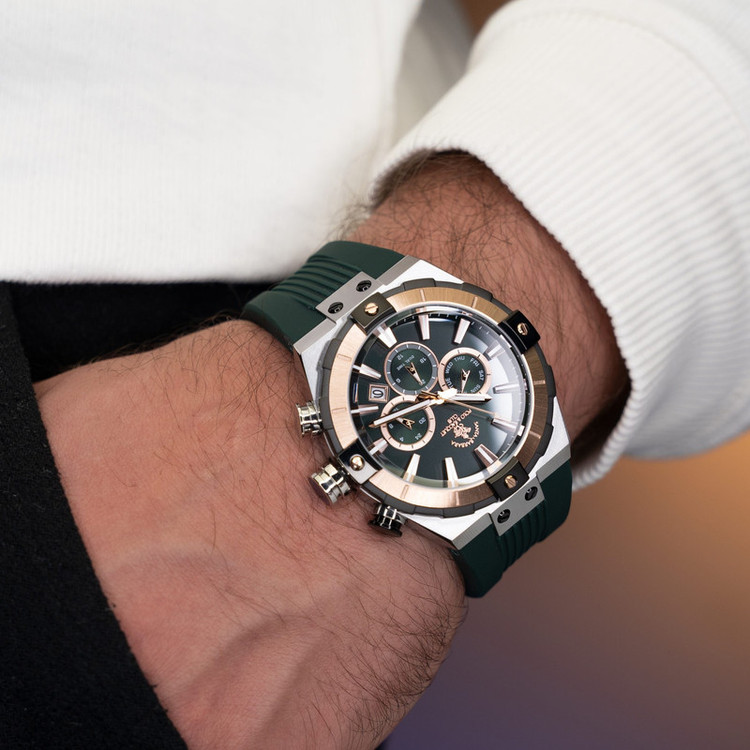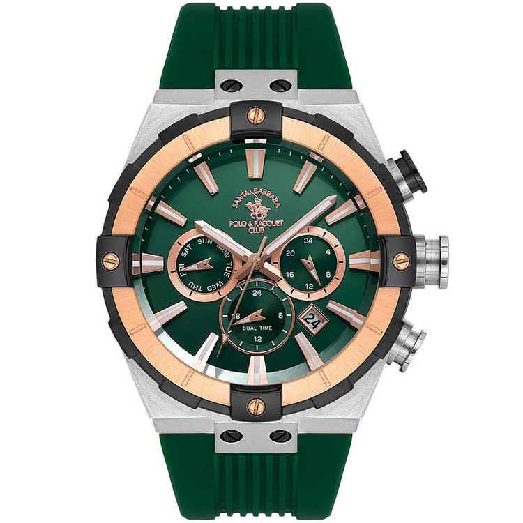 این طرح از برند ساعت پولو سانتا باربارا با طراحی خاص خود برای تیپهای اسپرت و نیمه اسپرت بسیار مناسب میباشد. بند این ساعت پولو از جنس رابر یا پلاستیک فشرده و نرم و بدنه ی آن از جنس استیل است و از رنگهای مشکی و نقره ای و رزگلد و سبز در آن استفاده شده است. از ویژگیهای منحصر به فرد این ساعت میتوان به طراحی زمخت و اسپرت ساعت اشاره کرد که برای تیپهای اسپرت و روزمره بسیار مناسب میباشد و از طرفی نیز سه موتوره بودن آن که حالت اسپرتی به ساعت بخشیده است. همچنین این طرح از برند پولو دارای نمایشگر روزهای ماه و هفته و وضعیت 24 ساعته بوده و دو تایمه بوده و دو ساعت را به صورت همزمان نمایش میدهد. عقربه ها و ایندکس های ساعت نیز کاملا شبنما میباشند و در تاریکی به راحتی قابل خواندن است. جنس بدنه ی این ساعت از استیل 318L بوده که بهترین نوع استیل است و کاملا رنگ ثابت میباشد.