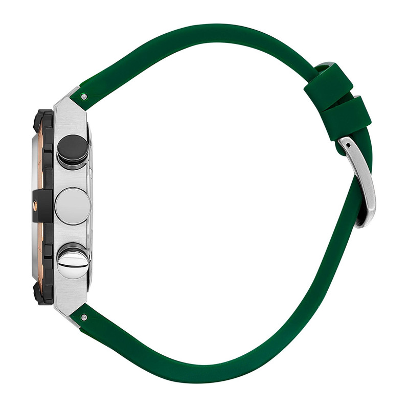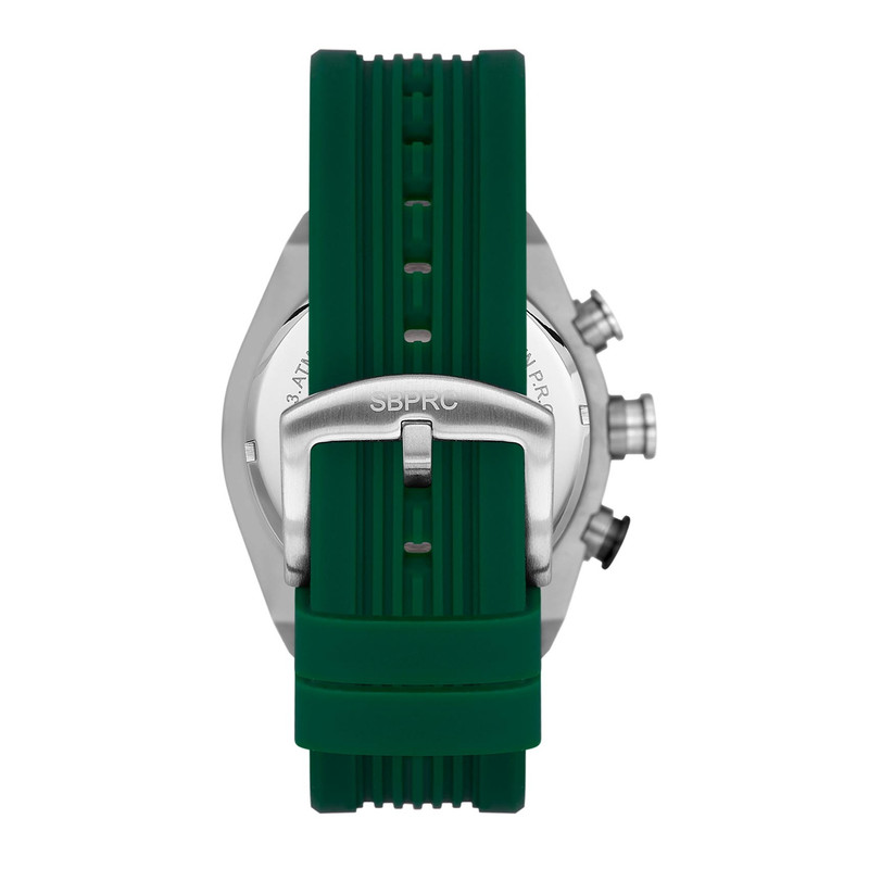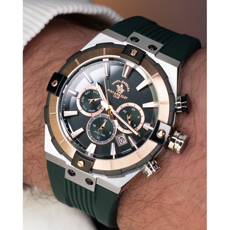 این طرح از برند ساعت پولو سانتا باربارا با طراحی خاص خود برای تیپهای اسپرت و نیمه اسپرت بسیار مناسب میباشد. بند این ساعت پولو از جنس رابر یا پلاستیک فشرده و نرم و بدنه ی آن از جنس استیل است و از رنگهای مشکی و نقره ای و رزگلد و سبز در آن استفاده شده است. از ویژگیهای منحصر به فرد این ساعت میتوان به طراحی زمخت و اسپرت ساعت اشاره کرد که برای تیپهای اسپرت و روزمره بسیار مناسب میباشد و از طرفی نیز سه موتوره بودن آن که حالت اسپرتی به ساعت بخشیده است. همچنین این طرح از برند پولو دارای نمایشگر روزهای ماه و هفته و وضعیت 24 ساعته بوده و دو تایمه بوده و دو ساعت را به صورت همزمان نمایش میدهد. عقربه ها و ایندکس های ساعت نیز کاملا شبنما میباشند و در تاریکی به راحتی قابل خواندن است. جنس بدنه ی این ساعت از استیل 318L بوده که بهترین نوع استیل است و کاملا رنگ ثابت میباشد.