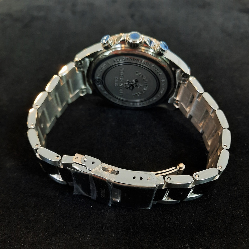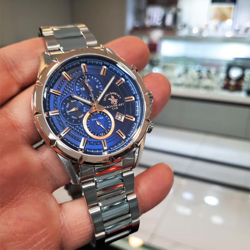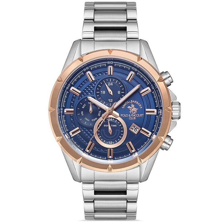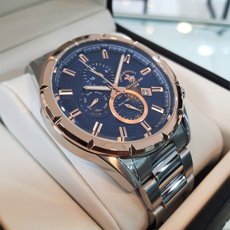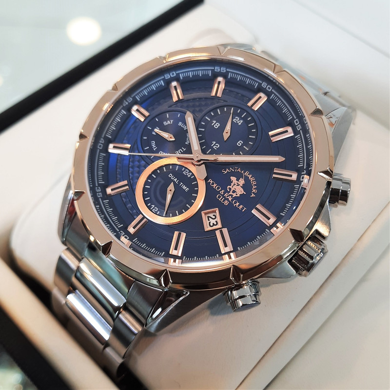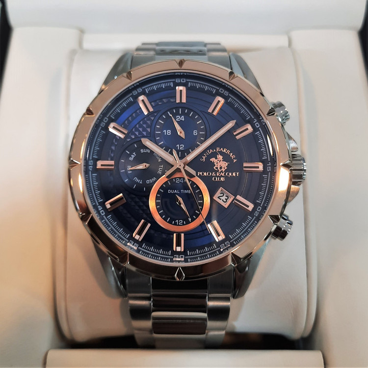 این طرح از برند ساعت پولو سانتا باربارا با طراحی خاص خود برای تیپهای اسپرت و نیمه مجلسی بسیار مناسب میباشد. بند و بدنه ی این ساعت پولو از جنس استیل است و از ترکیب رنگ های نقره ای و سرمه ای و رزگلد در آن استفاده شده است. از ویژگیهای منحصر به فرد این ساعت میتوان به دو زمانه بودن آن اشاره کرد و سه موتوره بودن آن حالت اسپرتی به ساعت بخشیده است. همچنین این طرح از برند پولو دارای نمایشگر روزهای ماه و هفته و وضعیت 24 ساعته میباشد.