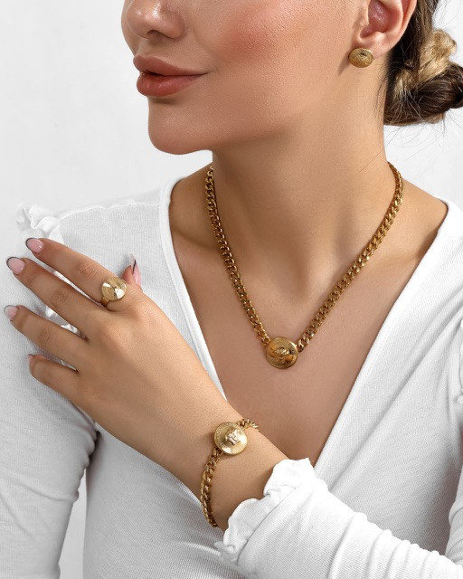 جزئیات دقیق طراحی، از زنجیرهای درشت تا پلاکهای گرد با نقش برجسته، همگی نشان از دقت بالا در ساخت دارند. این سرویس از لحاظ ظاهری کاملاً مشابه نمونههای طلا است، اما با قیمتی مقرونبهصرفه، گزینهای ایدهآل برای بانوانی است که به دنبال ترکیبی از ظرافت و اصالت هستند.